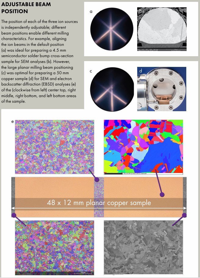 Положение каждого из трёх ионных источников регулируется независимо; разные положения луча обеспечивают различные характеристики фрезеровки. Например, выравнивание ионных лучей в стандартном положении (a) было оптимальным для подготовки поперечного сечения 4,5 мм припойной контактной площадки полупроводника для SEM-анализов (b). Однако широкое позиционирование плоского луча (c) было оптимальным для подготовки 50 мм медного образца (d) для SEM и анализа методом дифракции электронов обратно рассеянных (EBSD) (e) участков образца (по часовой стрелке от левого верхнего, правого среднего, правого нижнего и левого нижнего). ИНТЕГРИРОВАННОЕ ОХЛАЖДЕНИЕ ДЕРЖАТЕЛЯ