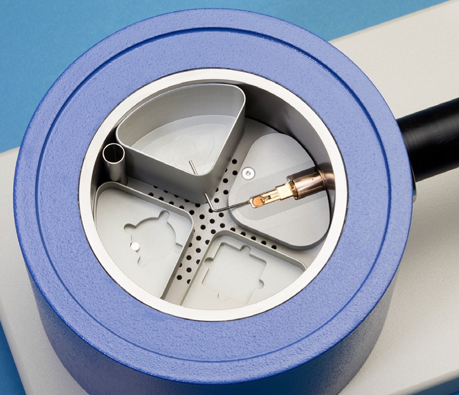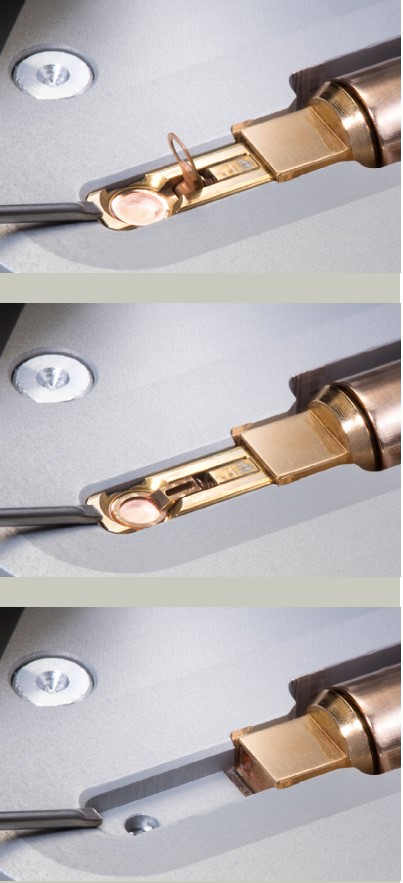 Одноцелевой, интегрированный держатель‑кронштейн (сверху) автоматически закрывается (в середине) при втягивании наконечника образца (снизу).